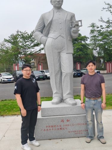 委国青年华侨岑伟豪(左)与陈锐豪在冯如石雕像前合照
