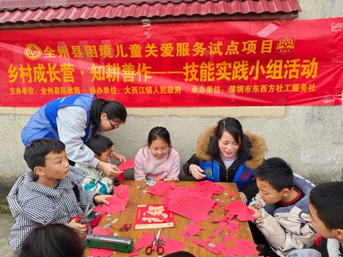 春寒渐消,年味未散,开学在即。为让困境儿童在假期尾声感受传统民俗魅力,丰富课余生活,收获成长与温暖,近日,在全州县民政局的指导下,深圳市东西方社工服务社联合大西江镇人民政府,在镇内开展“指尖年味——春节剪纸入门”主题关爱活动,以剪纸为纽带,为孩子们送上一堂兼具文化韵味与温情陪伴的开学前“暖心课”。