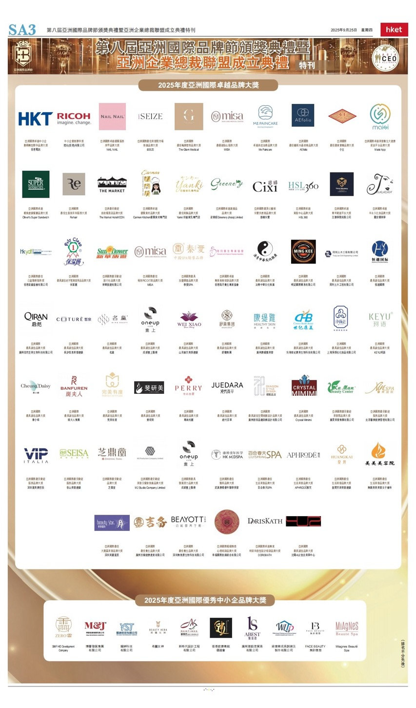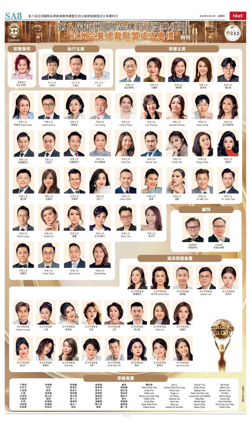 2025年9月25日,「第八屆亞洲國際品牌節頒獎典禮暨亞洲企業總裁聯盟成立典禮」在香港麗晶酒店盛大舉行。這場以「顯赫・舞台」為主題的活動,吸引了超過600名來自亞洲各地的企業翹楚、政商界名人及媒體代表齊聚一堂。