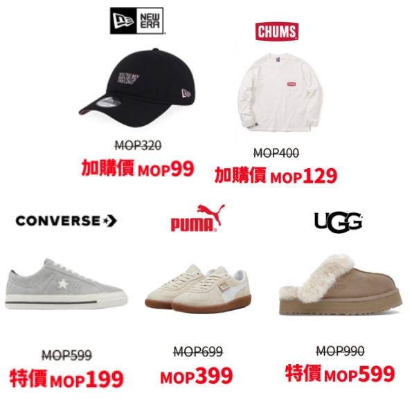 轻松拥有人气品牌!「匡威」、「彪马」、「UGG」等多款精选商品,售价由199澳门元起。与此同时,选购任意正价服装或鞋款,即可享99澳门元惊喜换购热门单品。