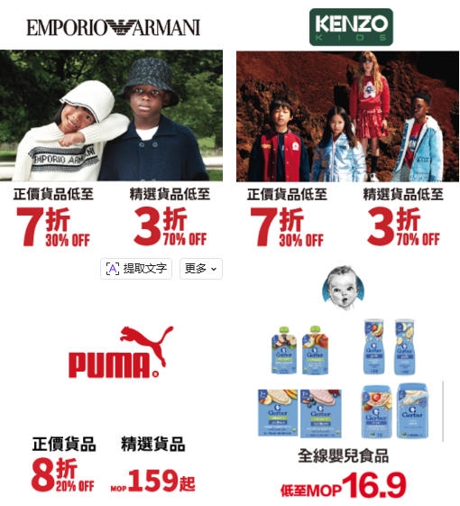 宝爸宝妈必备宝藏清单!儿童世界汇集全球精品玩具、信赖婴童食品与时尚童装,献上惊喜折扣:「安普里奥·阿玛尼」、「KENZO」等3折入手!「彪马」等精选货品159澳门元起!「嘉宝」全线婴儿食品低至16.9澳门元即可入手!一站式省心购,打造孩子的品质童年。