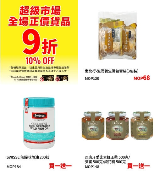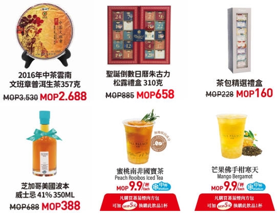 THANKFUL DAYS感谢日期间还可以一尝各国特色手信及礼品,「华联」茶叶、「查伯尼·艾特·沃克」巧克力礼盒、「威塔斯茶坊」、「菀枫丝」等品牌产品都有优惠; 感谢日期间各式饮品更低至9.9澳门元,让你用超值价格尽尝美味佳肴!