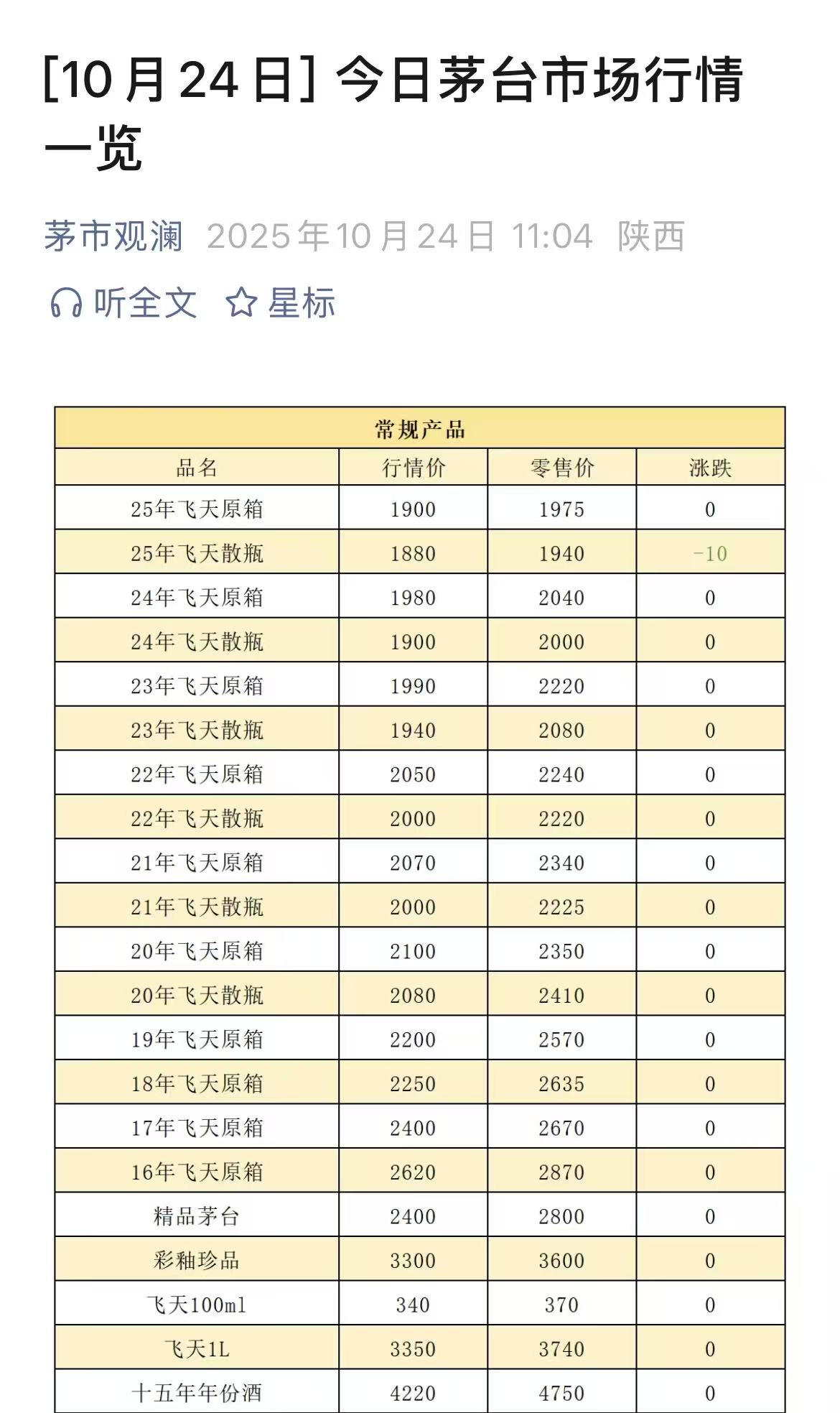 10月24日陕西地区茅台市场行情  来源:茅市观澜