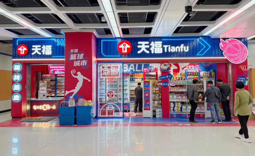 【东莞篮球城市主题店|元美站】作为“全国篮球城市”,东莞拥有深厚的篮球文化与全民运动氛围。天福以篮球为主题,打造集主题陈列、互动打卡与潮流零售于一体的特色空间。门店以篮球元素贯穿视觉系统,营造浓厚运动氛围,不仅是一座补给站,更成为展示东莞城市活力、传播篮球文化的精神窗口。